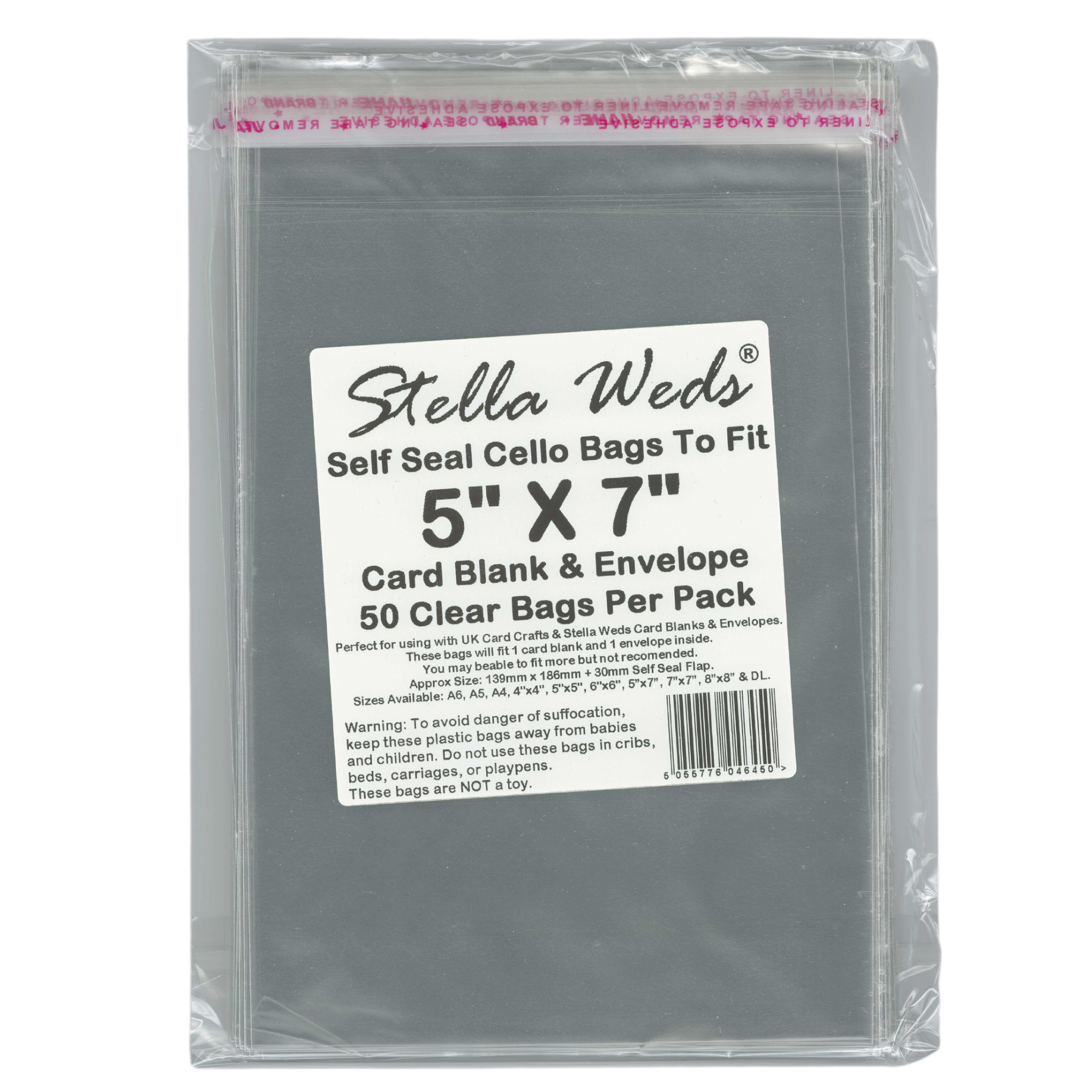 Introducing Stella Weds 5x7 Self-Seal Cello Bags, the perfect solution for storing or displaying your printed or handmade cards. Each pack contains 50 crystal-clear bags tailored for 5x7-sized card blanks and envelopes, measuring approximately 139mm x 186mm (13.9cm x 18.6cm or 5.47 inches x 7.32 inches). Safely store and elegantly present your cards with these precisely-sized cello bags. 30mm Self Seal Flap. They can also be used for packing Sweets, Cookies, Gift, Jewellery and many more items.